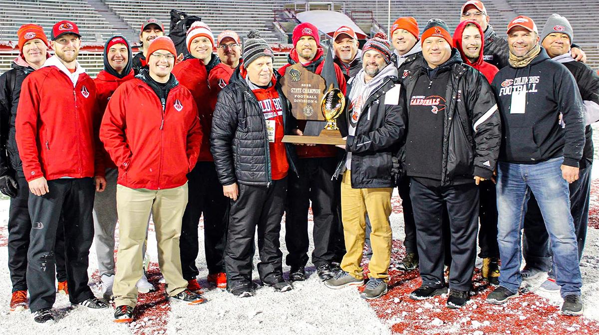 In just his second year as head coach of the Cardinals, Selgrad and his team brought home a state football title. On Nov. 17, Columbus completed a perfect 14-0 season with a 23-21 victory over Catholic Memorial in the WIAA Division 4 State Championship at Camp Randall Stadium in Madison, Wis. Trailing by just one point entering the fourth quarter, with the snow coming down, senior kicker Corbin Hynes kicked the go-ahead field goal with under five minutes to go in regulation. The Cardinals defense then prevented Catholic Memorial from scoring and brought home the third state championship in program history. After losing to Catholic Memorial in Level 4 of last year's playoffs, Selgrad and his team had redemption on their minds when both teams entered this year's contest undefeated.